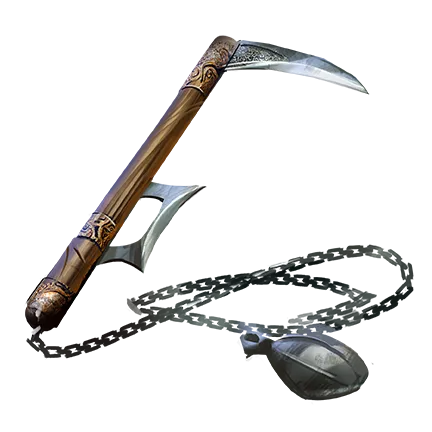This impressive but demanding weapon consists of a weight attached to a kama via a length of chain, which aids with disarming an opponent or attacking from a distance.