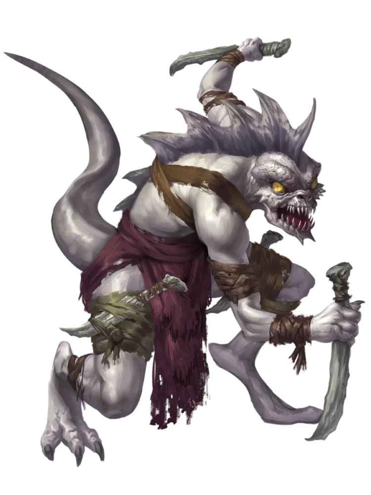 Reptilian humanoids who live in the uppermost reaches of the Darklands, xulgaths (known as troglodytes to many surface-dwelling folk) often attack intruders in their territory on sight. They live in simple familial communities called clutches, battling rival groups and other aggressive Darklands inhabitants in order to survive. They occasionally raid surface settlements, usually at the behest of cruel, bloodthirsty leaders who are often themselves in the thrall of more powerful creatures like nagas or demons. A typical xulgath has dull gray, dark gray, or ashen scales, with a long tail and bony protrusions that run the length of their spine. A typical xulgath is 5 feet tall and weighs 150 pounds.
