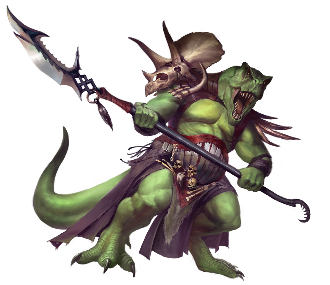 Enormous tyrannosaurus-humanoids, saurians are ancient beings who predate the rise of humans and dwell in the world's primeval jungles. While the saurians presented here are evil, saurians of all alignments exist.