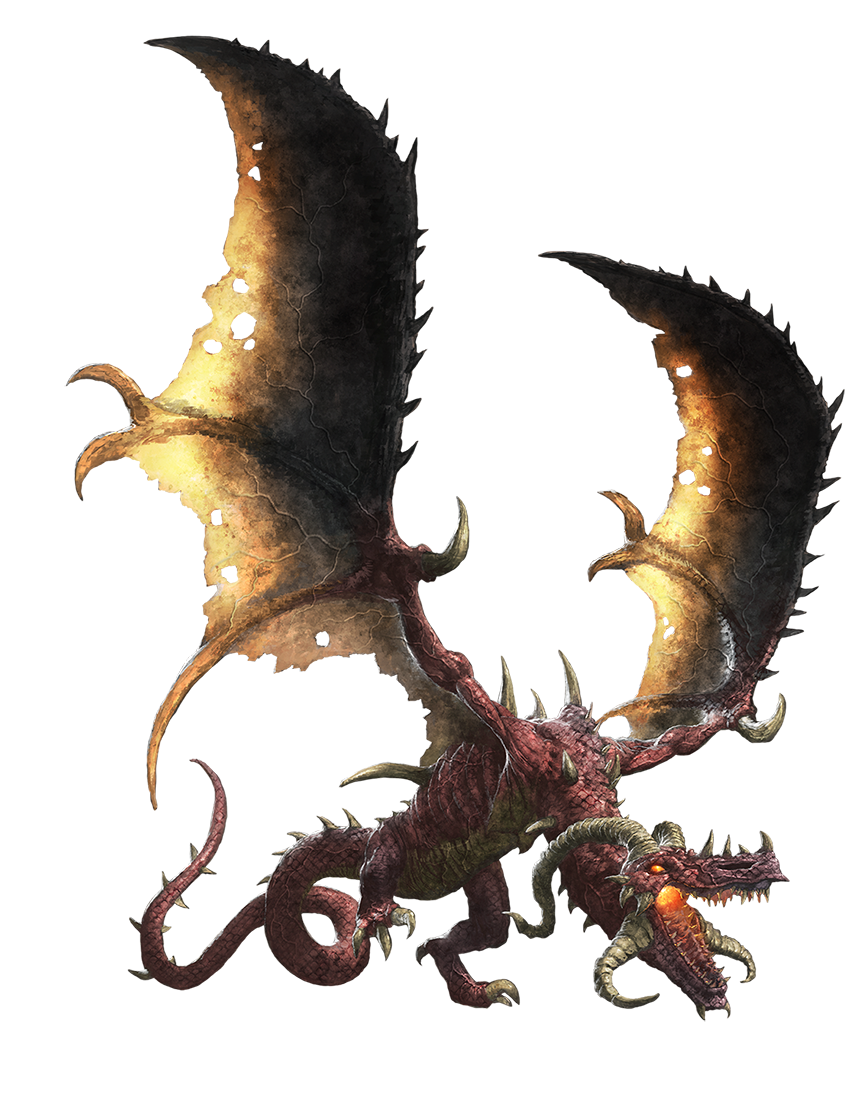 The distant kin of red dragons, flame drakes thankfully lack the intelligence and ambition of their larger cousins, but are no less territorial or violent. Flame drakes dwell near volcanoes and magma, but it’s not unheard of for one to drift into nearby areas like forests or wooded hills. Their scales are usually some shade of red, occasionally fading to smoky blacks and grays along the edges of their wings and the tips of their tails.