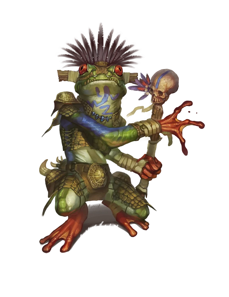 Boggards are aggressive humanoid amphibians who thrive in swamps, marshes, and even some rain forests. Boggards hatch from eggs into tadpoles, fiercely competing for food and even consuming their siblings in that struggle. Over 3 years, the surviving boggards develop arms, legs, and lungs while learning the rudiments of hunting, crafts, and warfare—everything needed to survive in their might-makes-right society. At the top of most boggard hierarchies lords a hulking swampseer imbued with sinister divine magic.