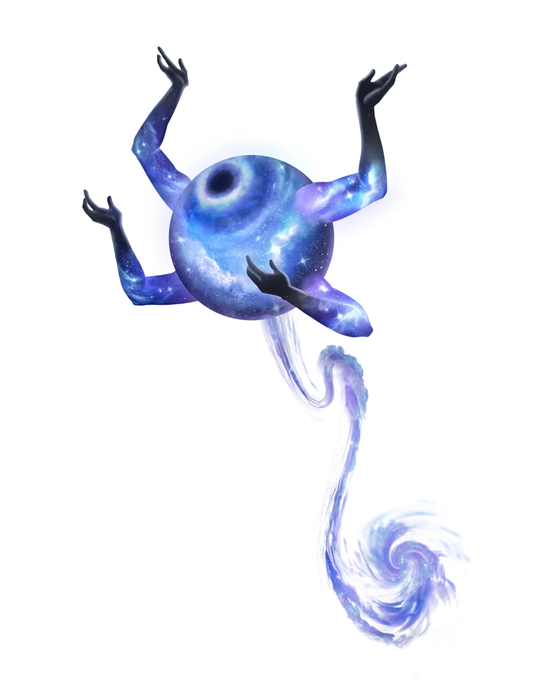 Akhanas are massive eyes formed of cosmic matter that monitor the balance of birth and death. They understand the profound influence living things have on the cosmos and silently perform their duties of supporting and pruning life. Akhanas seem utterly unconcerned by the fate of souls after death, often leaving undead in their wake or attracting daemon scavengers. Psychopomps often despair over akhanas' cryptic actions, forced to clear out sudden backlogs of souls or even battle the aeons directly. Their “tail” is a twisting column of cosmic energy that can drain vitality from creatures and seal their fate.