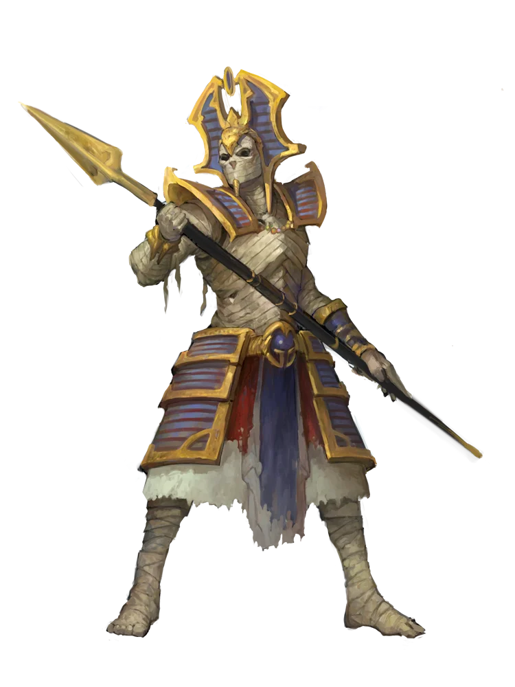 While mummy guardians are undead crafted from the corpses of sacrificed— usually unwilling victims—and retain only fragments of their memories, a mummy pharaoh is the result of a deliberate embrace of undeath by a sadistic and cruel ruler. The transformation from life to undeath beneath the scorching desert sand is only somewhat less awful, but as the transition is an intentional bid to escape death by a powerful personality who fully embraces the blasphemous repercussions of the choice, the mummy pharaoh retains its memories and personality intact.