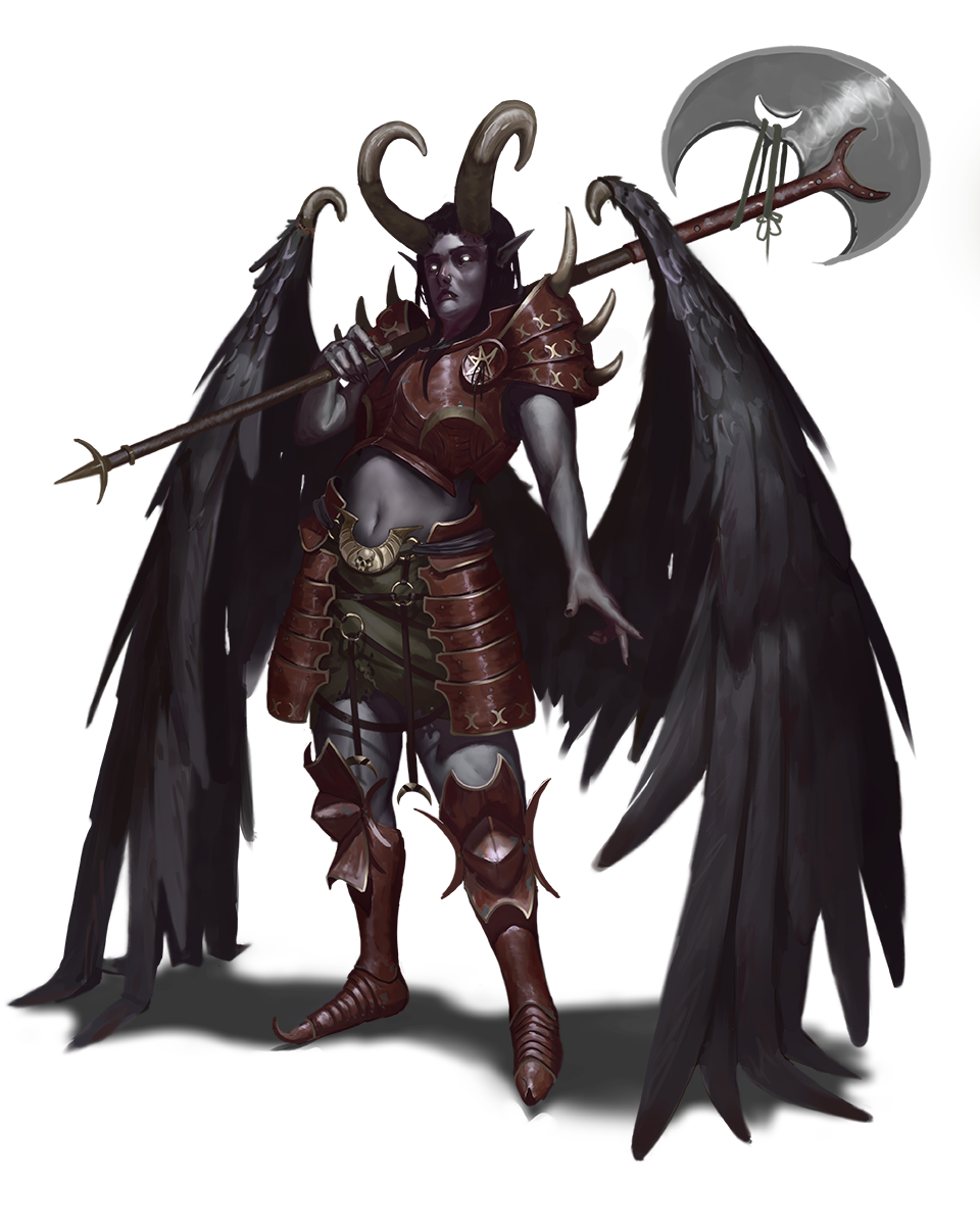 Masters of corruption and architects of conquest, devils seek both to tempt mortal life to join in their pursuit of all things profane and to spread tyranny throughout all worlds. The temptations they offer mortals range from great powers granted by the signing of an infernal contract to twisted favors following a whispered pledge to a diabolic patron, or any number of even subtler exchanges. Those who succumb to these temptations find themselves consigned to an afterlife of endless torment in the pits of Hell, wherein the only hope of escape lies in the chance of being promoted to become a devil in the infernal ranks. Every devil has a specific role to play in the upkeep of the remorseless bureaucratic machine that is Hell, from soldiers and scholars to inquisitors, lawyers, judges, and executioners. Lowly lemures and imps perform subservient labor to more powerful and specialized devils, such as contract devils and erinyes, while the greatest pit fiends command entire infernal armies.