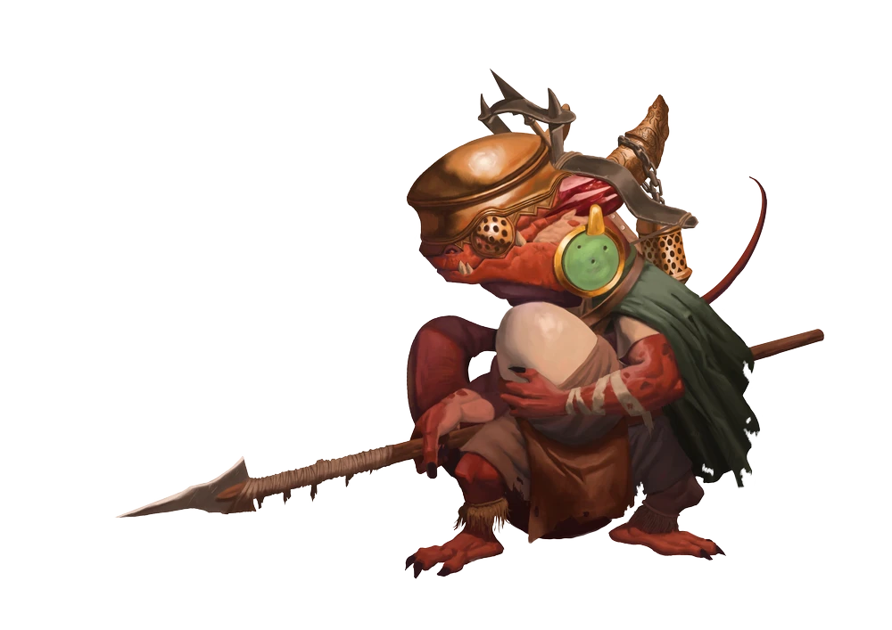 Kobolds are small reptilian humanoids. They lurk in dark spaces, usually tunnels and mines beneath the earth, in either warrens of their own design or complexes discovered and colonized after the original builders have moved on. Though kobolds are far more pragmatic than courageous, they use every inch of their cunning to even the playing field between themselves and other, stronger creatures. They attack from the darkness and at range, and kobold artificers and engineers master the art of simple but effective traps, which they use to protect their lairs. Kobolds are skilled at working together by necessity, and they often set up ambushes or hit-and-run assaults that allow them to do the most damage possible without being harmed in return.