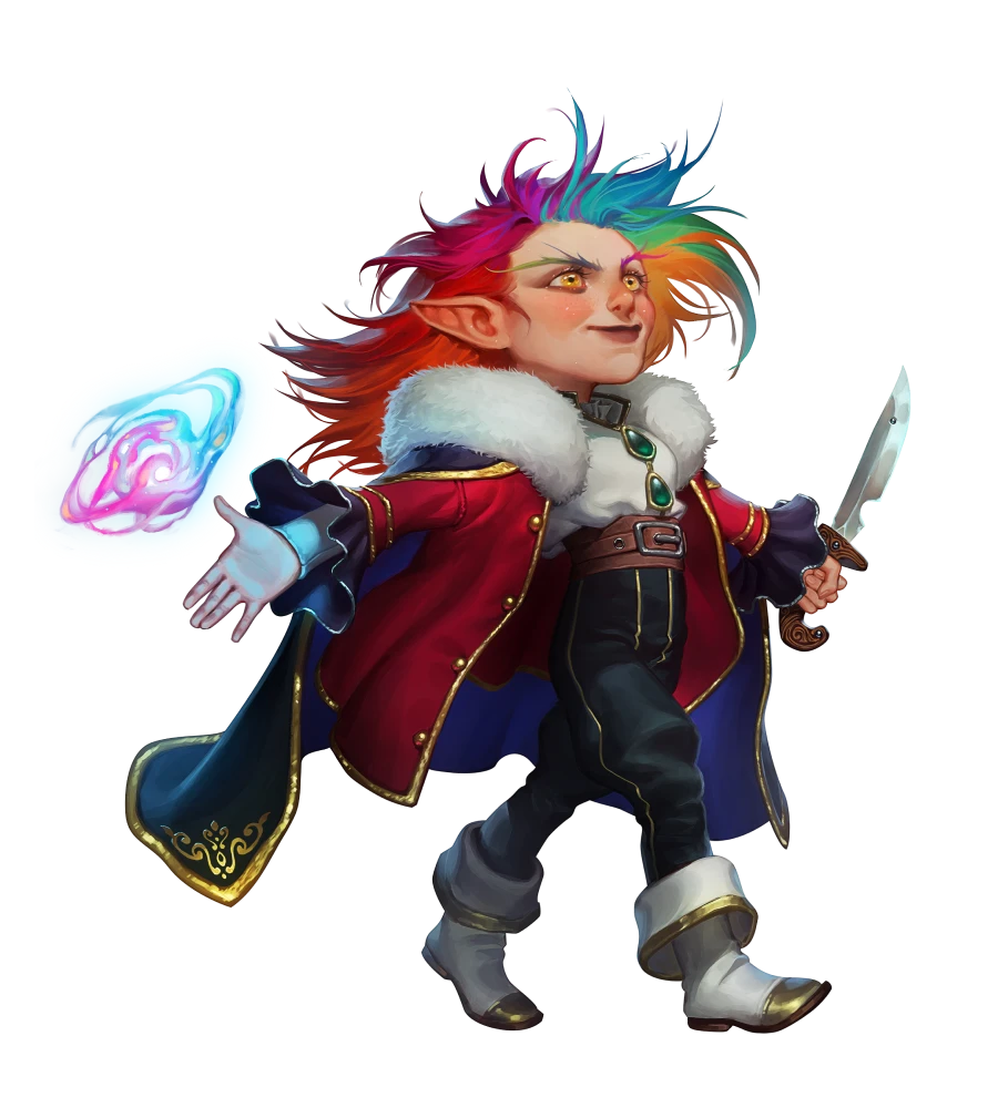 Gnomes are known for being creative and curious. They stand at around 3 feet tall, and their vivid personalities match their naturally vivid hair and eye color. Gnomes possess a natural connection to their ancestral home, the First World. They crave adventure and new experiences to fight off an ancestry-wide affliction known as the Bleaching. Gnomes who fail to dream and innovate begin to slowly lose their color and fall into a deep depression.