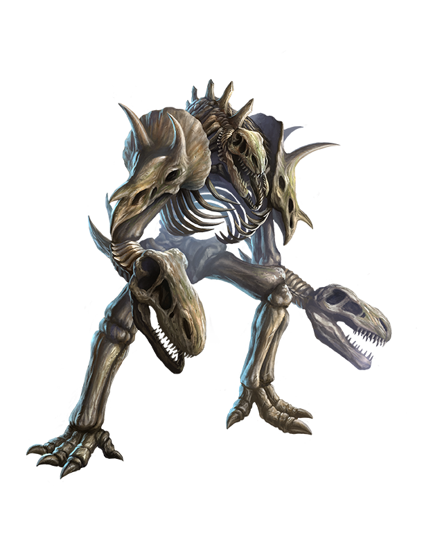 Fossil golems are typically made from the fossilized bones of dinosaurs and other ancient megafauna, though some crafters stretch the definition and instead use magically petrified bones of dragons or even giants. Not bound to any specific model, fossil golems are crafted to be as terrifying as possible instead of models of anatomic accuracy. As such, most fossil golems are nightmarish saurian amalgams whose massive arms end with the complete skulls of apex predators like tyrannosauruses, their bite enhanced to petrify flesh.