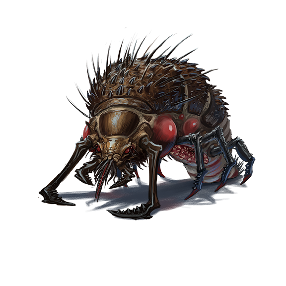 Rivkas are parasitic monsters that cling to the sides of kaiju. In their natural form, they resemble giant cockroaches with eight razor-like legs and two mouths—one between two vicious pincers plus a second, much larger mouth on their abdomen. With this secondary mouth they feed off the primordial energy of whichever kaiju they've latched onto.