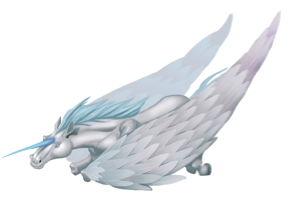 Alicorns are a creation of arcane intervention, a rare transformation that occurs when a unicorn is exposed to large sources of magic. Massive in size, their strong bodies are matched with two large wings on their back, a long spiraling horn, and a mane that continually ripples in an unseen wind.