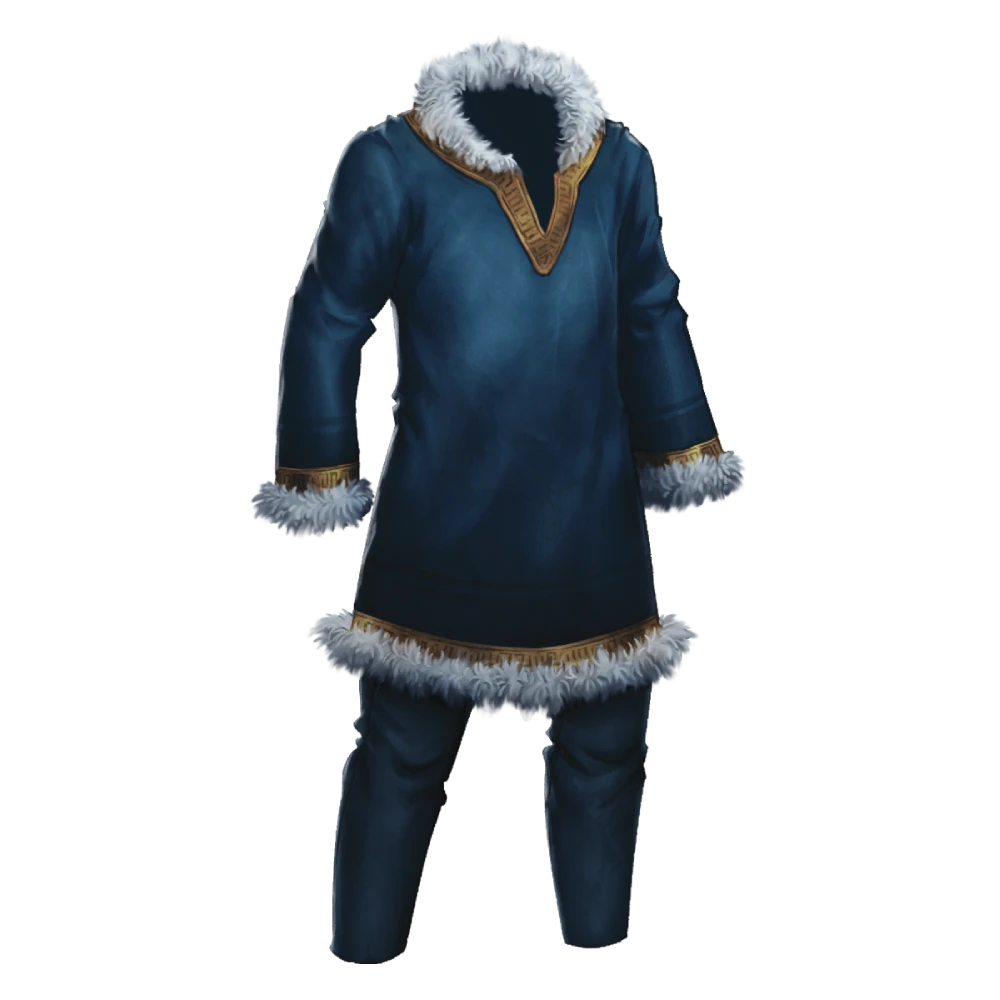 padded armor consists of a beautifully woven pleated tunic adorned with a gold pattern and narrow bands of white fur trim on a deep blue background with matching pants, all of which are meant to signal wealth and status. This