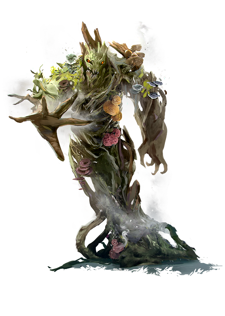 Each Melfesh Monster is unique at any given time since the parent fungus only gives birth to a single monster at once, and each of these creations works a little differently and looks a little different from the last. However, their forms all bear similarities. A twisting mass of creeping vines creates the bulk of a Melfesh Monster's body, sculpted into a towering figure that can glide effortlessly across the ground. Mossy growths and trumpeting fungi cover the creature like matted fur, dripping from its back and shoulders in excess. A hood of dampened bark and thick moss covers its face, revealing only a crusty wooden jaw and a pair of gleaming red eyes. An acrid stench of burning manure follows the creature, often serving as the only warning that anyone gets before it attacks.