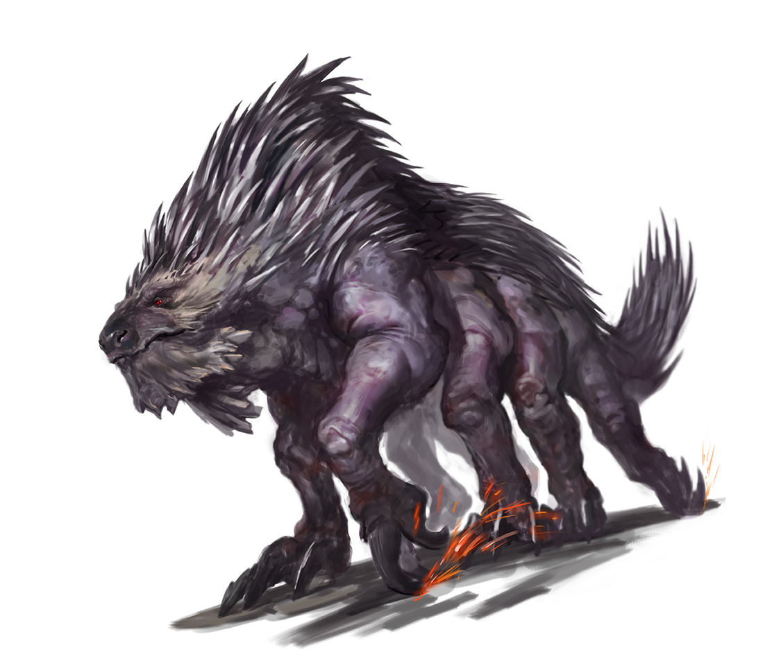 The terrifying apex predators known as eberarks torment their prey, spewing oil from their mouths that they can then set alight. Commonly called flint beasts, eberarks drag their overlarge claws (four on each paw) along the ground as they move, creating showers of sparks with every grating step. Incredibly vain, eberarks relish displaying their dominance over other intelligent beings. Some eberarks conquer small settlements, demanding tribute from residents and travelers, or lead bands of violent brigands.