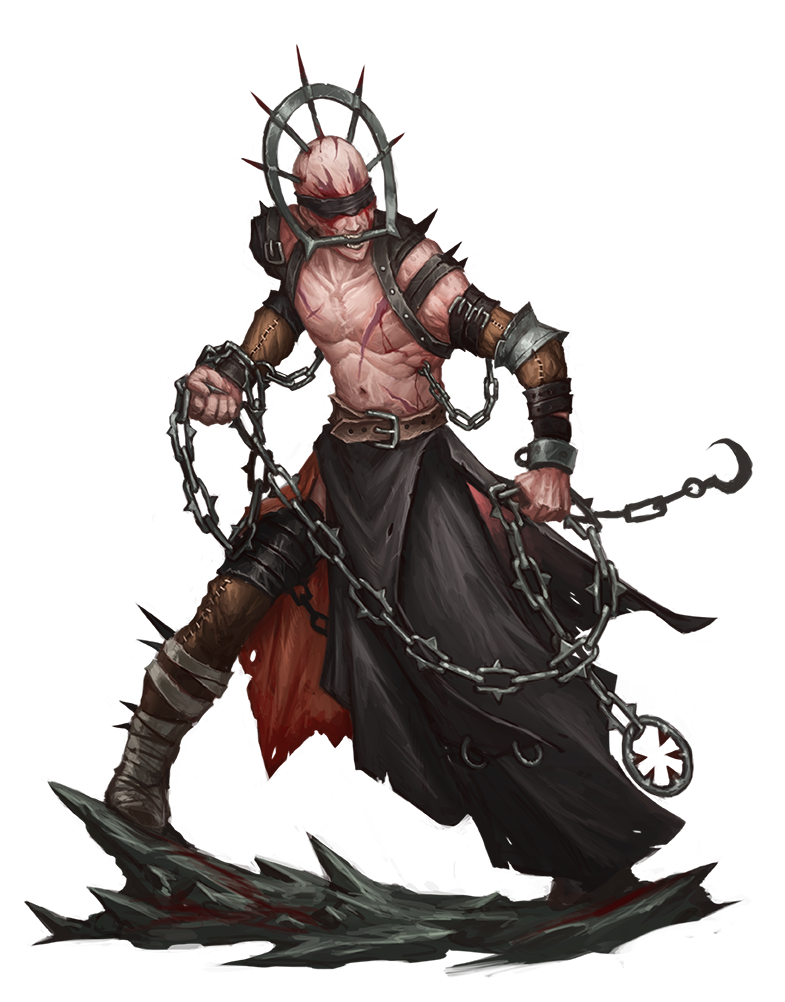Melee [one-action] barbed chain +20 [+15/+10] (evil, magical, reach 10 feet, trip, versatile S), Damage 2d8-2+9 piercing plus 1d6 evil and 2d6 persistent bleedDivine Innate Spells DC 27 (-4 dmg); 5th chilling darkness; 3rd fear
