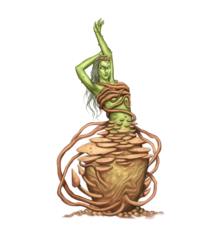 Hundreds of years ago, a cadre of powerful succubus assassins invaded the Abyssal realm of the demon lord of disease and fungus, Cyth-V'sug. These succubi sought to slay a powerful witch who had befouled a profane temple the assassins served. The succubi failed at their mission, but from their corpses grew the first fungus tyrants. Pleased with this development, the witch then seeded numerous worlds on the Material Plane with fungus tyrant spores, who have since grown and thrived in their new environments as rot thrives in a corpse. Today, hundreds of fungus tyrants inhabit the fouler locales of the Material Plane. They're particularly fond of large cave systems and ruined cities, but also can be found in corrupted woodlands where blighted fey rule or in the sewers of active cities that spew vast amounts of magical waste.