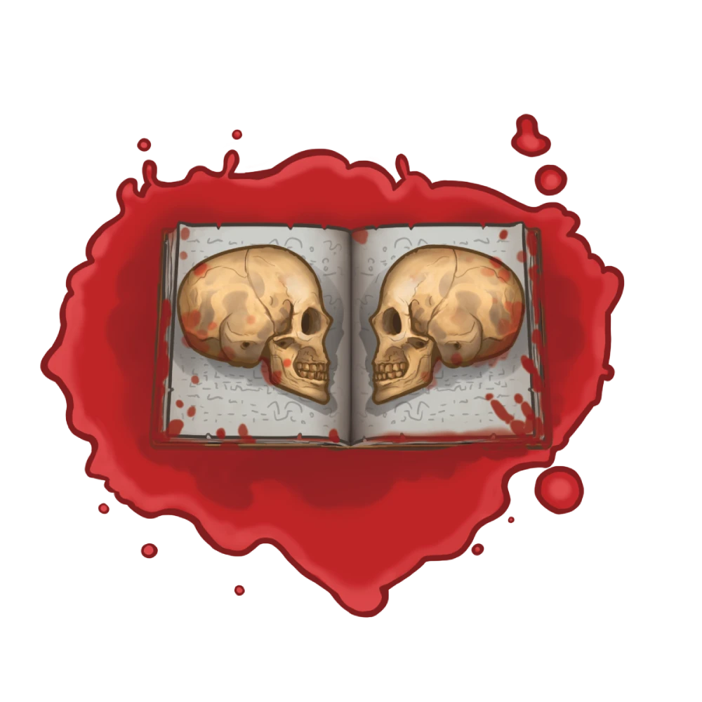 Religious Symbol two skulls facing atop a grimoire in a pool of blood