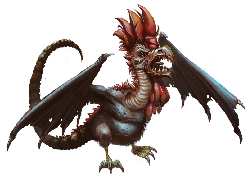 The first cockatrice is rumored to have hatched from a rooster’s egg incubated on a dung hill by a toad. Whether or not the rumor is true, the cockatrice’s monstrous appearance certainly doesn’t contradict its strange and filthy origin story, and these creatures are more than capable of propagating on their own. Cockatrices are remarkably fecund and gather in flocks of up to a dozen members. Each flock contains only a few females. The males—which differ in appearance from the females by having warty wattles and gnarled combs— often fight with each other, with lower-ranking males eventually driven away to find their own lairs or compete among other flocks. Most creatures who run afoul of a solitary cockatrice do so with one of these surly outcasts.