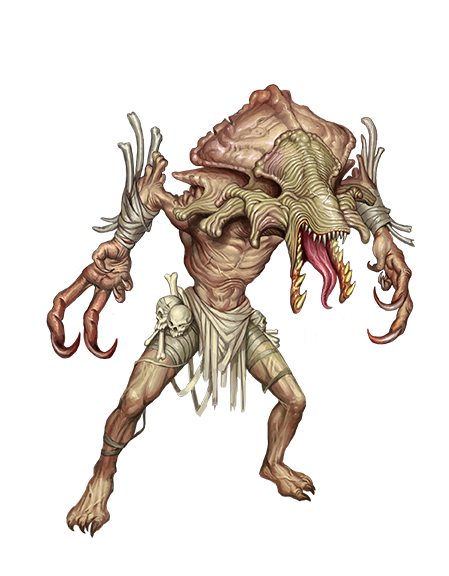 Despite their need to feed, caulborn rarely care to interact with other creatures, especially beings that could react to their appearance with fear or hostility. They occasionally make exceptions for accomplished scholars or storied travelers, however, bartering their own lore for outside secrets.