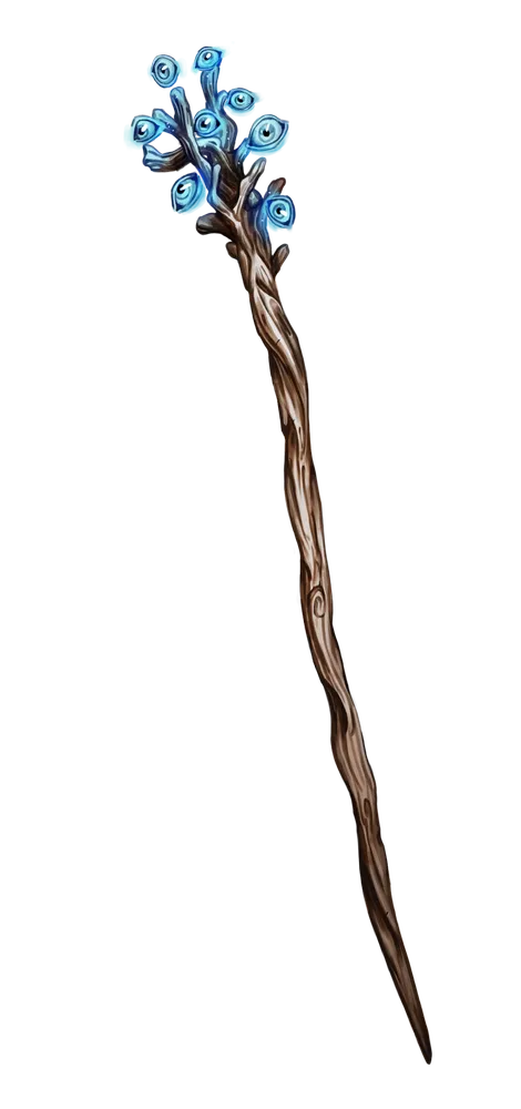This bizarre staff is made from oak, capped with a cluster of eye-shaped gemstones that seem to move and undulate at the corner of your vision. While wielding the staff, you can peer through the eyes on the staff rather than your own, using your normal visual senses (including any benefits of spells like see the unseen). You can maneuver the staff to see things around corners, at higher elevations, or in places where the staff can fit but your head can't. This doesn't provide sufficient line of effect to target creatures around corners. The eyes are as vulnerable as your eyes and can be affected by anything that alters your vision, such as a blinding flash of light.