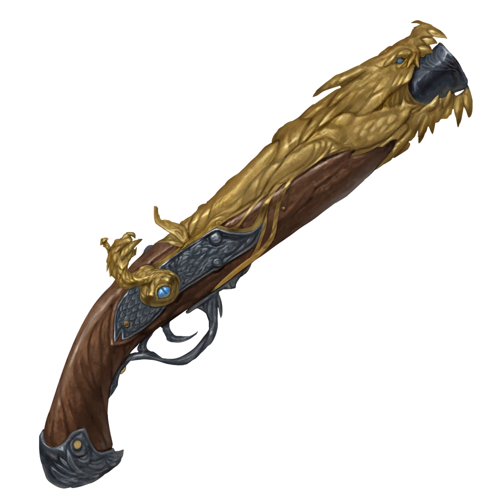 blunderbuss, a dragon-mouth pistol fires pellets from a flared barrel. Though less powerful than a blunderbuss, the dragonmouth pistol is appreciated for its portability and onehanded design. The name was coined because of the destructive belch of this handheld scatter weapon, but many gunsmiths craft dragon-mouth pistols with elaborate embellishments that resemble a stylized dragon's maw framing the barrel.
