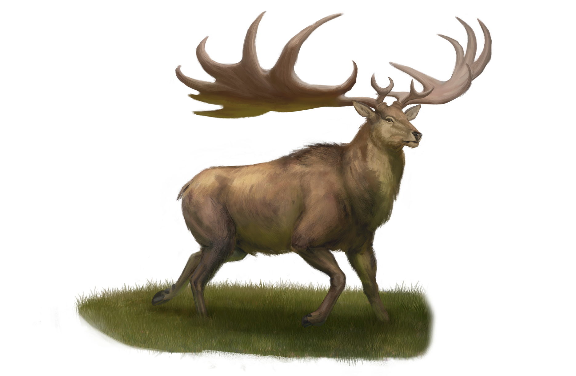 The megaloceros is similar in form to the elk, but far superior in size. The average male's antlers weigh nearly 100 pounds and can be wider than his body is long. Megaloceroses stand up to 9 feet tall, weigh 1,500 pounds, and grow antlers over 12 feet wide.
