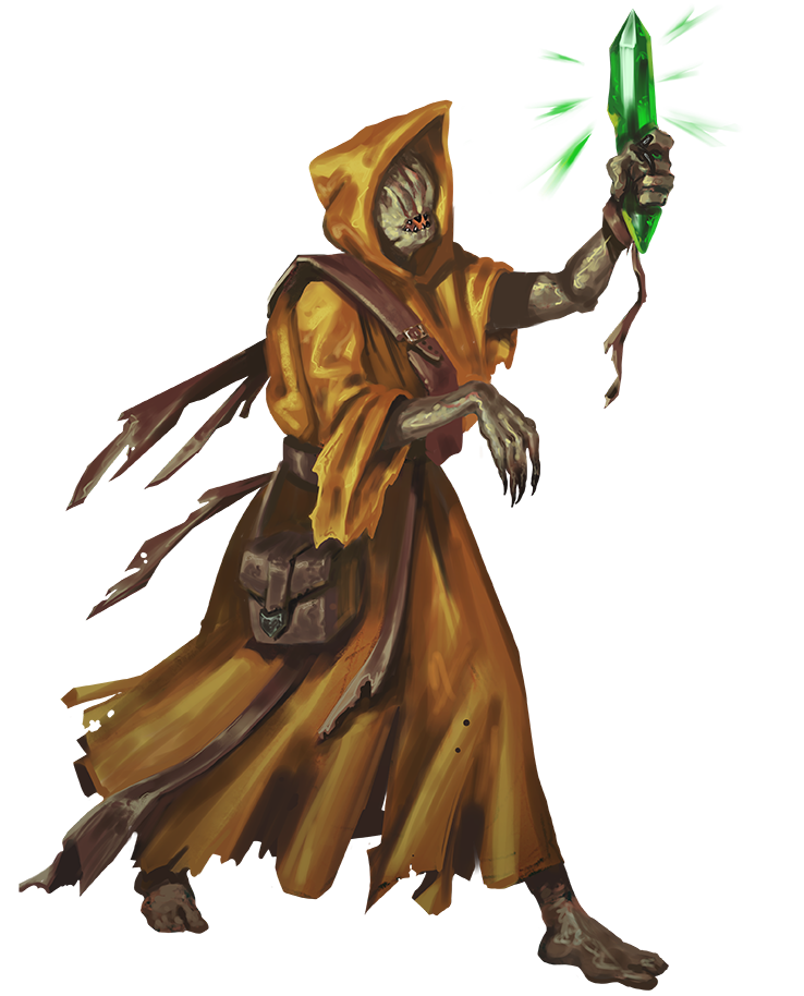Withered hermits wrapped in tattered rags, these scarred, eyeless creatures command strange secrets of the earth and interpret the fateful energies of the subterranean depths. In some regions, stygiras are worshipped as seers or even gods, although they lack the ability to grant spells to clerics and are often not aware of their worshippers at all. In other areas, they have strange ties to the ancient empires of the cyclopes, often dwelling in the oversized ruins those creatures left behind long ago. To many stygiras, gemstones harvested from ancient cyclopean mosaics have even greater magical properties than other crystals.