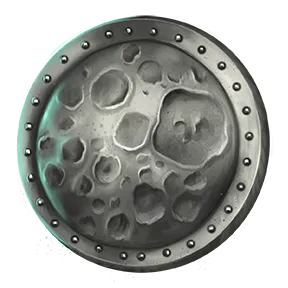 This high-grade adamantine heavy rondache (Hardness 17, HP 100, BT 50) bears a +3 greater striking shield boss and has dents that resemble craters on its surface. While wielding the shield, you have fire resistance 15.