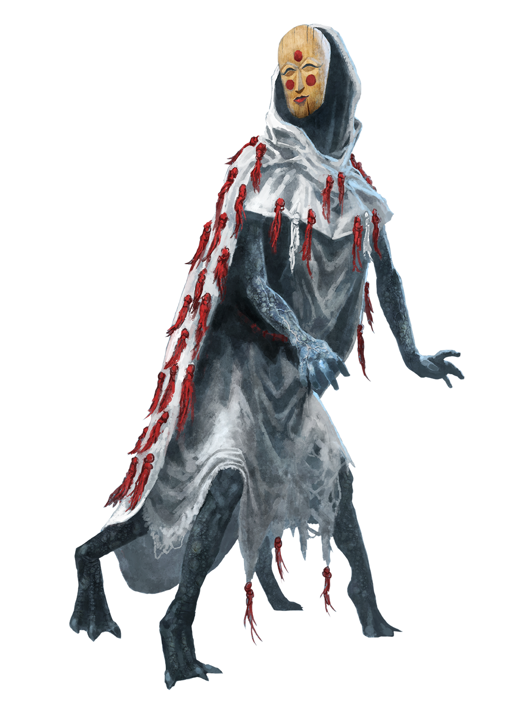 The form of Taljjae's body can vary from visit to visit or even moment to moment, but it's easily recognized due to its signature cloak and masks. So long as Taljjae's mood is placid, it can be approached safely, but its mercurial temperament can be hard to predict.