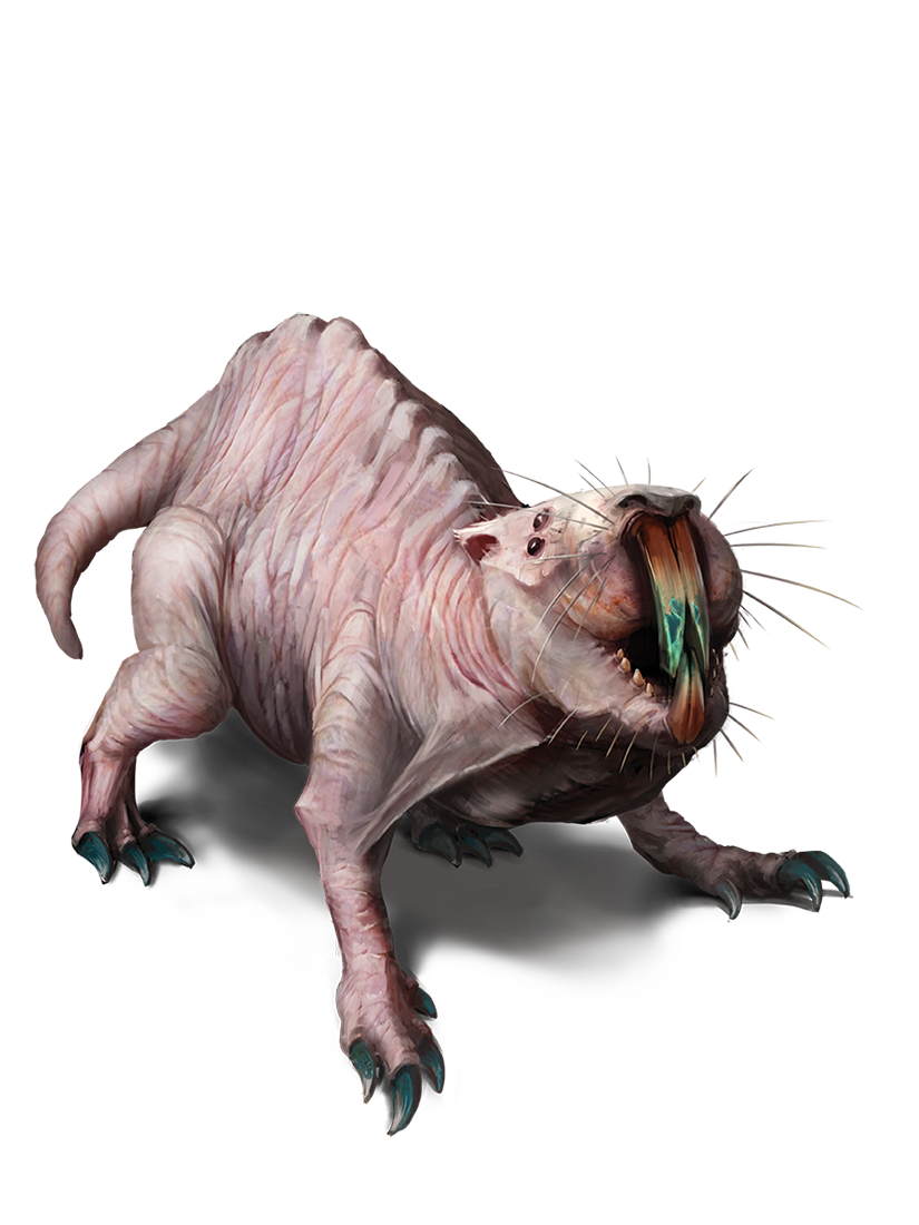 Scourges of the upper Darklands, these enormous, mole-like monstrosities slice and burrow through solid stone with massive forearms and adamantine-strong claws. Shulns grow to about 20 feet long and have four tiny, nearly imperceptible eyes; a long, pale snout; four thick-muscled legs that end in long, serrated claws; and a stubby pink tail. As a young shuln matures, its unique metabolism produces adamantine that becomes infused throughout its skeletal system. In addition to making their claws and fangs nearly unbreakable, this unique physiological trait makes shulns unparalleled burrowers and highly sought by monster hunters who hope to harvest the precious material from their corpses.