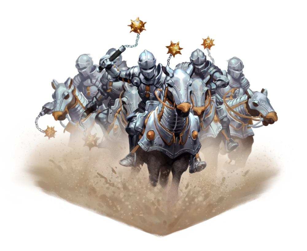A charging band of knights, mounted upon heavy warhorses and clad in steel plate, is a sight to be feared on the battlefield. The weight of their armor, however, makes them ill-suited to extended overland maneuvers. Squads of squires are needed to tend to horses, repair armor, and otherwise support the heavy cavalry group between battles. Despite these limitations, their ability to crash through enemy lines makes them an invaluable tool for professional armies.