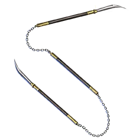 A fusion of a naginata and sansetsukon, this three-section weapon has a sweeping, curved blade along each of the outer sections. Though difficult for anyone but an expert weapon master to use effectively, the three-section naginata can be wielded at devastating speed to slice or smash apart a foe.