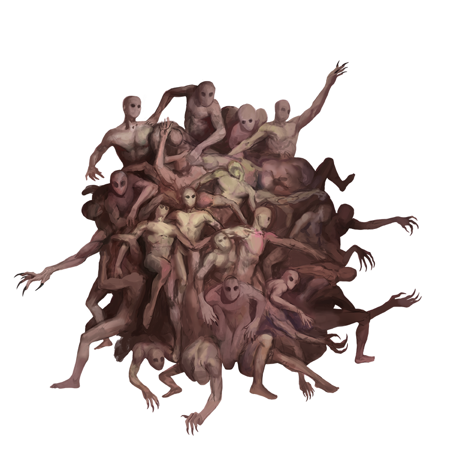 Although penquals are independent beings, each resembles a tight crowd of featureless humanoids pressed together in a mob. Penquals are most at home in large population centers, where they can don clothing to blend in. When large crowds, such as those found at festivals, are scarce, a penqual hunts at night, where a mass of revelers might draw attention but not suspicion.