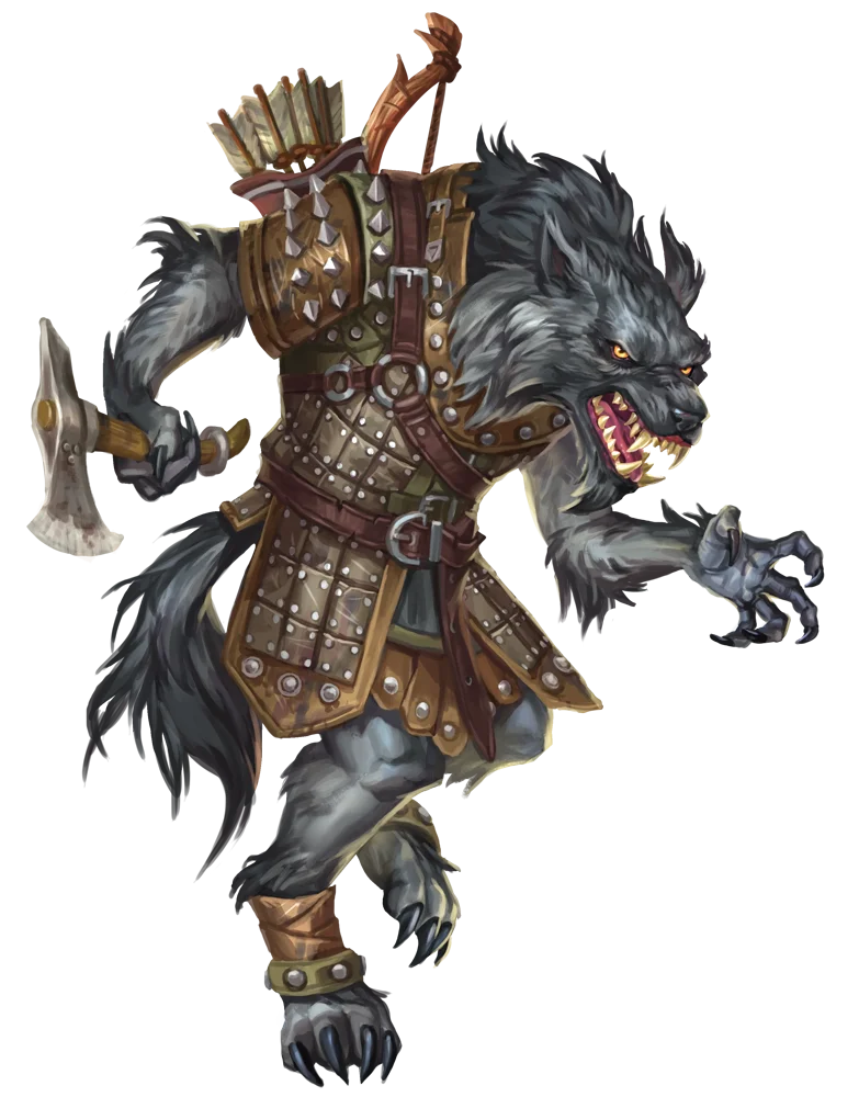 The curse of the werewolf—known as lycanthropy to many—instills in its carriers the hungry bloodlust and predatory instincts of the wolf. Werewolves tend to dwell on the fringes of society or in small settlements where, in their humanoid forms, they work as laborers, hunters, farmers, or trappers. At night, however, these same villagers transform into violent killers and sadistic stalkers who prey on their neighbors. Werewolves are the quintessential werecreature, and the first that comes to mind when most people speak of such beings.