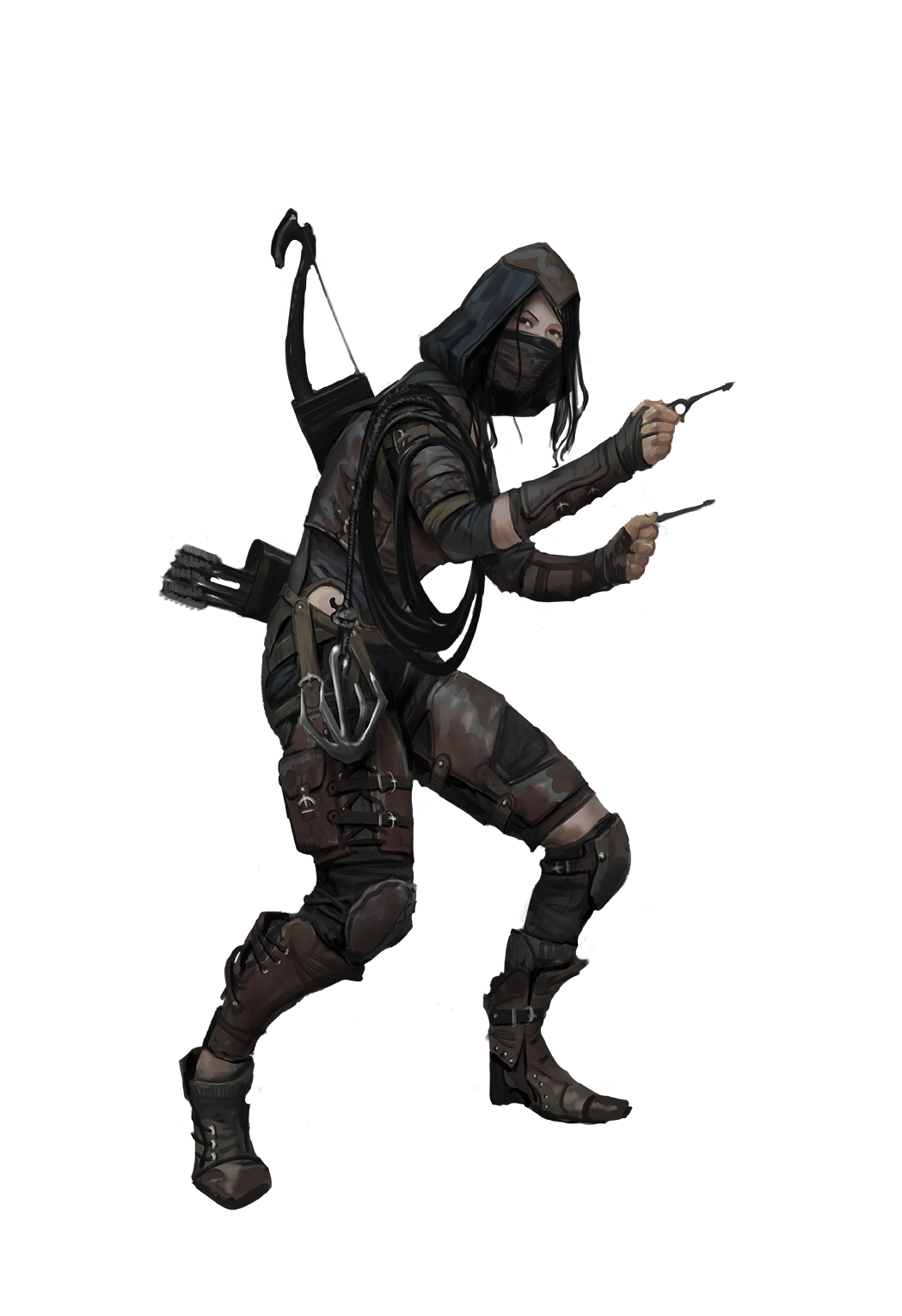 Items climbing kit, composite shortbow (10 arrows), leather armor, lesser darkvision elixir, sap, thieves' tools