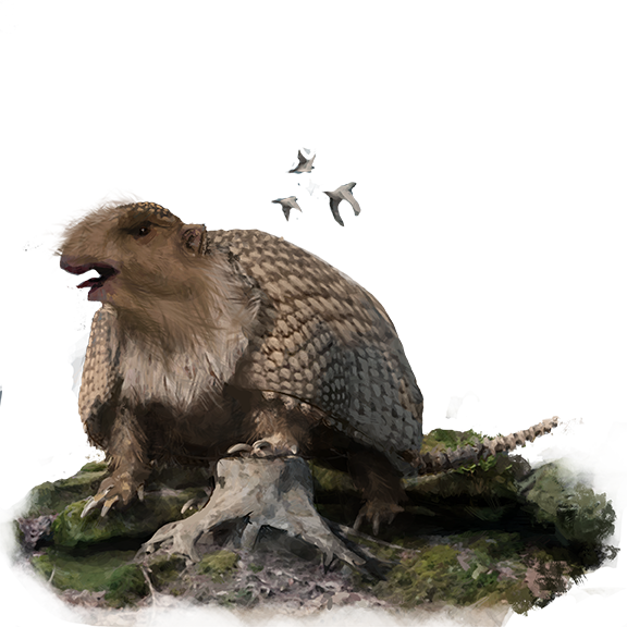 When cornered, a glyptodon uses its powerful digging claws to scrape or scare away attackers. Glyptodons can use their tails to ward off smaller predators, but generally do so only as a last resort.