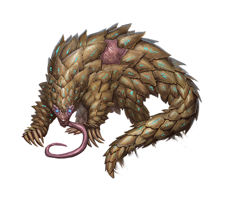A servant of Torag, Stoneriver resembles a pangolin with glowing blue eyes and brassy, rune-covered scales. Stoneriver burrows through Golarion's mantle and crust as he hunts down subterranean fiends, aids virtuous communities, and defends sacred sites, often collaborating with dwarves.