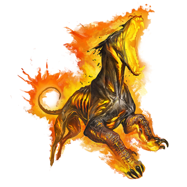 A hell hound’s appearance dismisses any doubts as to its infernal origins—flesh the color of burning pitch, teeth as sharp as any fiend's pitchfork, and a shroud of ever-burning hell are are all trademark features.