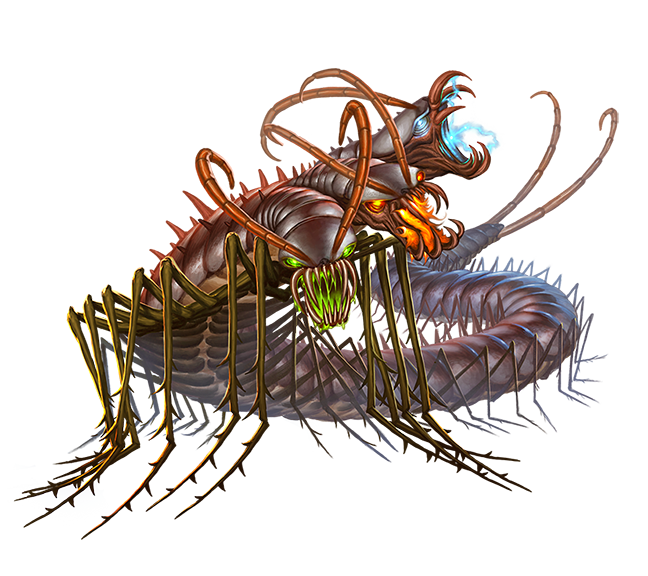 Fearsome centipede-like creatures, mukradis are three-headed predators with a devastating array of breath weapons. A Darklands version of the mukradi is rumored to exist. It’s said these variant mukradis have black scales, and all of their heads spew a black, acidic goo that animates before being reabsorbed by the mukradis.