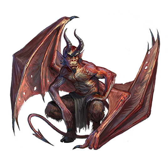 Imps are infiltrators and corruptors who, despite their diminutive stature, are more than capable of subtly influencing a weak-willed individual into performing increasingly evil acts over time. An imp will often agree to serve a mortal and act docile and loyal in a long-term plot to eventually damn its master’s soul to Hell. Imps are born directly from Hell itself, rather than from mortal souls, and thus they serve outside the usual diabolic hierarchy, granting them leeway to pursue their specialties. Despite standing a mere 2-feet tall, imps can be vicious combatants, flying out of reach and turning invisible to escape should the odds turn against them.