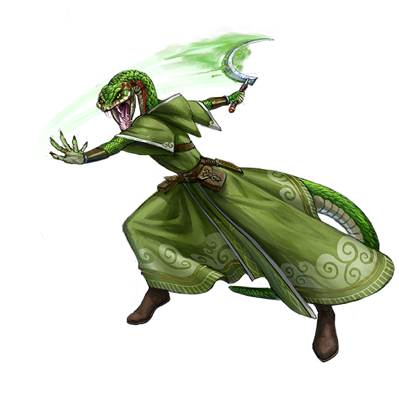 Before their ancient clash with humanity devastated their civilization, serpentfolk were masters of a sprawling underground empire. Few serpentfolk survive today; their power is shattered, their god Ydersius decapitated (although not quite slain). The cunning, intelligence, and magical abilities of serpentfolk have diminished from their ancient heights, and most are born without these boons. Those serpentfolk who retain their ancestry’s legacy of intelligence and magic are known as zyss, and they look down upon their more numerous kindred with a mix of disdain and shame. They see these offshoots as a curse on their kind, resulting from their god’s decapitation and the pandemonium during the fall of their underground empire, and have dubbed them aapoph, meaning “chaos made flesh.”