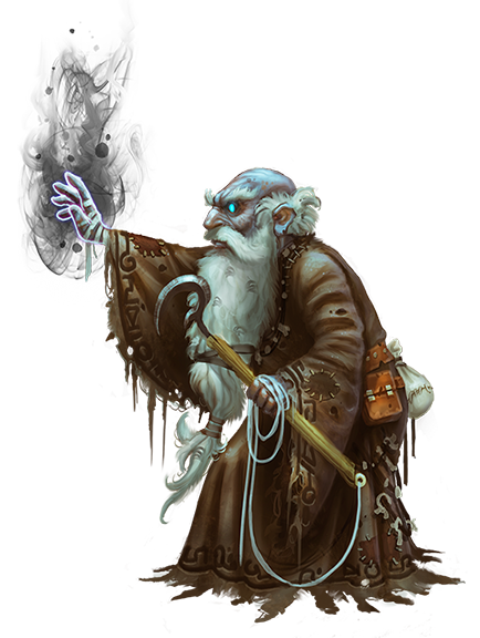 Deros are short, wiry humanoids with milky white eyes, gray-blue skin, and wild shocks of off-white or gray hair. The descendants of a mysterious type of fey abandoned in the deepest, darkest caverns of Golarion, deros are the subject of fearful legends and folk tales to most of the world’s surface races. They skulk beneath major metropolitan areas, performing cruel and twisted experiments on unwilling subjects. A dero is 3 feet tall and weighs approximately 70 pounds.