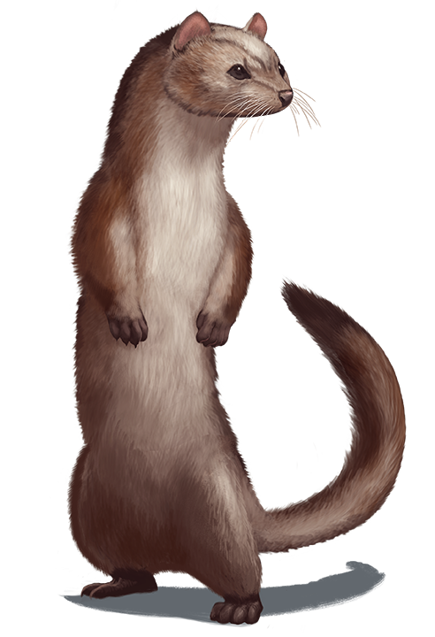 Despite their small stature, weasels are skilled hunters. Nearly fearless in pursuit of food, they frequently kill creatures up to five times their own size. Their preferred tactic is to latch onto the back of their victim's neck and constrict with their jaws until the target dies. To keep themselves well fed, weasels kill more creatures than they need and stuff their victims into hollow logs or empty dens to eat later. Scholars have observed weasels, both in the wild and captivity, perform a bizarre behavior in front of their prey. They rush about unpredictably, throw themselves to the ground, wriggle into and out of burrows, and generally appear to behave entirely irrationally. In response, their prey becomes confused or seemingly hypnotized, which gives the weasel an opportunity to dash forward and strike a killing blow.
