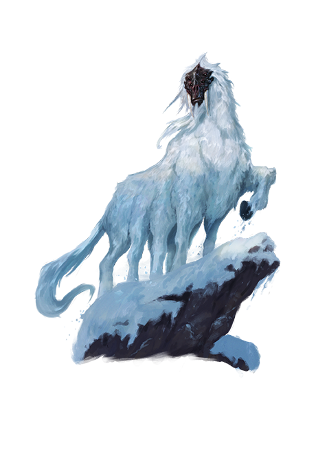 Melee [one-action] tusk +10 [+5/+0], Damage 1d10+5 piercingMelee [one-action] hoof +10 [+5/+0], Damage 1d8+5 bludgeoningRanged [one-action] spit +12 [+7/+2] (range increment 30 feet), Damage 1d8+2 bludgeoningIce Stride A wolliped isn't impeded by difficult terrain caused by snow or ice, nor does it need to attempt Acrobatics checks to keep from falling on slippery ice.Regurgitated Wrath [one-action] Frequency once per hour; Effect The wolliped regurgitates the contents of its stomach and spits them at the target, dealing 2d6 bludgeoning damage and 2d6 acid damage. The target attempts a DC 20 basic Reflex save, and on a failure also becomes sickened 1 (sickened 2 on a critical failure).Trample [three-actions] Medium or smaller, hoof, DC 20