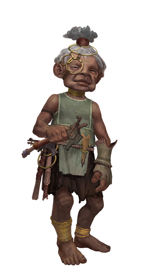 Renowned in Tengah folklore as divinely gifted artisans and crafters, anugobus are a curious group of tiny humanoids native to the central islands of Minata. Countless stories describe anugobus sneaking around Minatan cities to tinker with and improve upon other humanoids' structures and architecture.