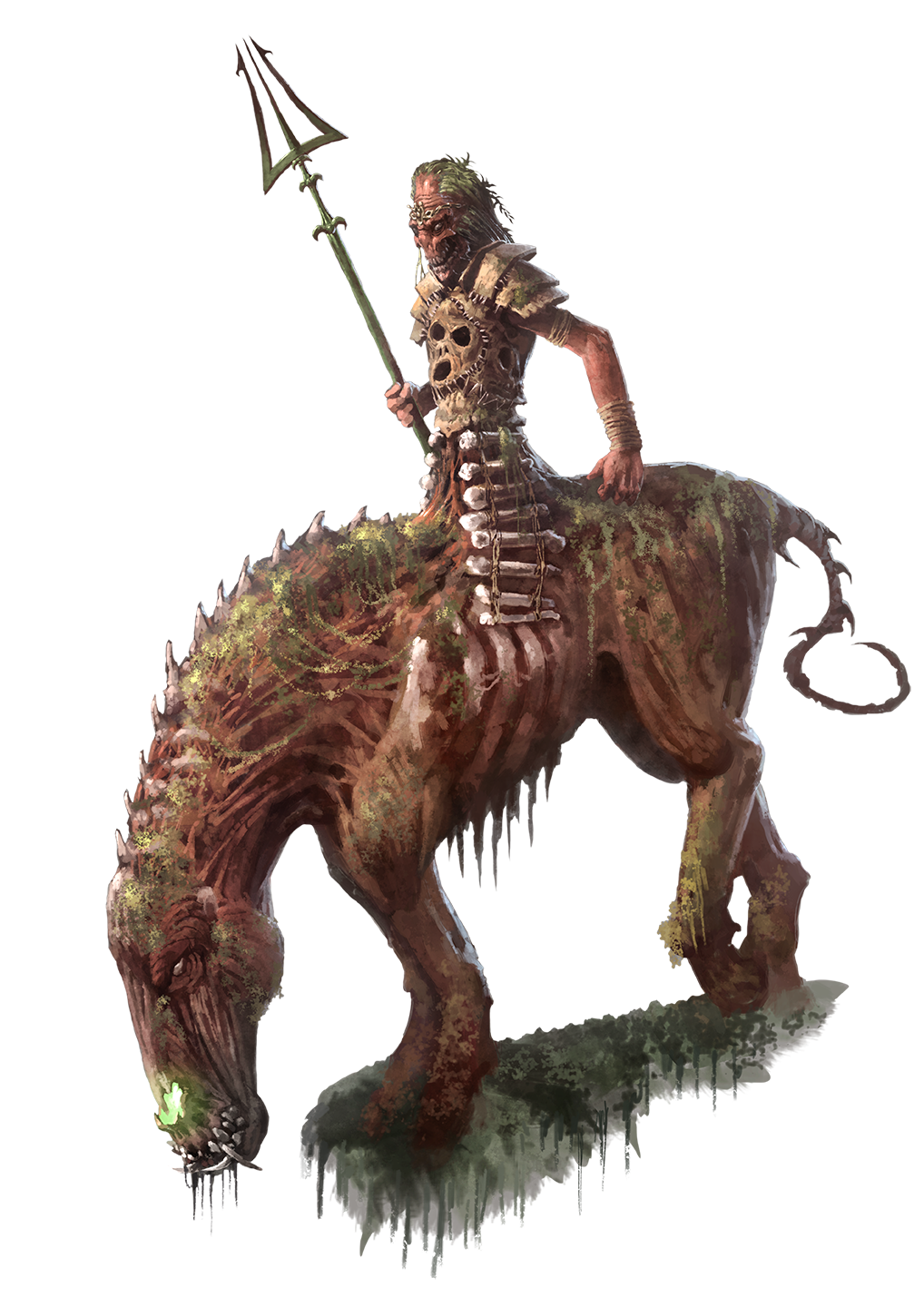 Bearing a resemblance to the flayed nuckelavee that lurks in stagnant swamps, the Kallas Devil distinguishes herself by being able to separate herself from her mount without issue, as well as with her powers of disguise and subtlety. Though her wicked trident and violent fury are enough to sear her image into the minds of the local people, it's the Kallas Devil's ability to slip unseen among her would-be victims that elevates the creature beyond the ranks of a common horror. No matter how careful the residents of Riverton are with their youth and the vulnerable, the Kallas Devil claims her chosen target more often than not, luring the hapless victim toward doom while wearing a smiling child's face.