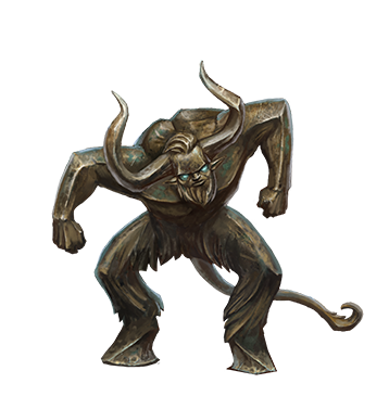Although made of iron, an Azmakian effigy's exterior is thick with rust that flakes off as the construct moves and fights. Effigies charge into battle on massive hooves, impaling enemies on long, curving horns. The effigy's most well-known attack—and the ability that makes even the bravest warrior tremble—is their terrible rusting breath, which can reduce even legendary magical weapons to useless scrap. Wise adventurers attempt to fight an effigy at a distance, but these constructs are surprisingly swift and able to outrun many foes.