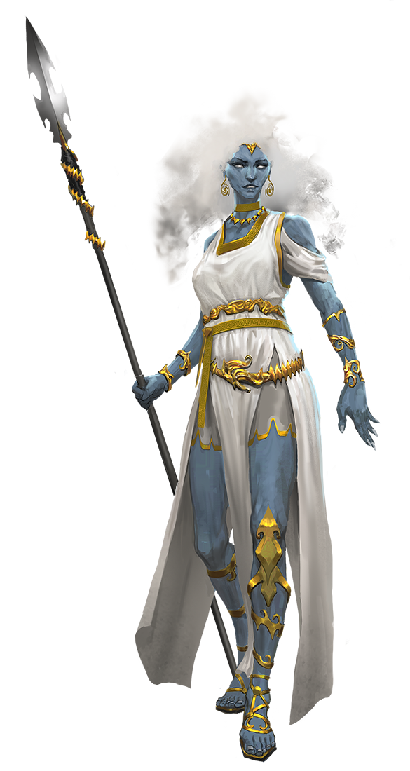 The graceful and regal cloud giants have skin of milky white to powdery blue. Unlike most giants, cloud giants are quite morally diverse. A handful are neutral, but of the others, roughly half are good, while the other half are evil. Good cloud giants are often civic-minded builders of roads and settlements, and are interested in trading goods as well as cultural innovations. It’s not uncommon for such giants to approach their neighbors with diplomacy and build strong relationships with other peaceful peoples. Conversely, evil cloud giants are often isolationist and xenophobic. Preferring hidden mountain valleys and settlements in the caves and among the crags of lonely peaks, they raid for what they want and treat other creatures like inconsequential insects. These opposing philosophies can generate a great deal of strife among neighboring cloud giant communities, and the raiders often threaten the trade deals of their peaceful cousins.
