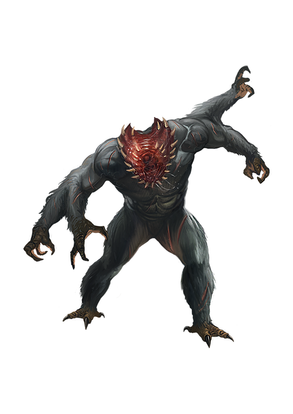 A gug’s most horrid feature is its barrel-shaped head, which splits vertically to reveal numerous rows of sharp, yellow teeth and an open throat. Its eyes on either side of its head-jaw are small but keen. Bony ridges protect its eyes from the frantic flailing of its prey, as it prefers meals of raw and writhing meat over fungi and molds. It grips said prey with powerful arms that split at the elbow into a pair of forearms, giving it four clawed paws. These monstrous brutes are covered with shaggy black fur, often crusted with blood and gore.