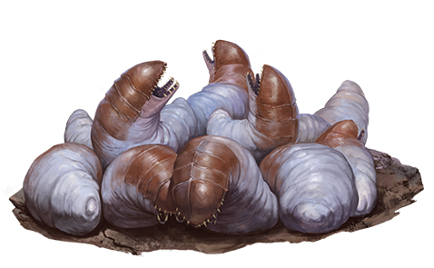 When a brood of cave worms hatches from their eggs, the foot-long worms mass together, forming a swarm of ravenous larval worms. This swarm travels ceaselessly, consuming anything in its path. The young are drawn to movement, as living, squirming prey tends to be the most nutritious. As they age, they incorporate more minerals into their diet to support carapace growth.