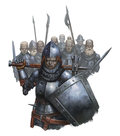 A hryngar breccia squad is a group of hryngar martial combatants armed with melee weapons and steel shields. Though more likely to be encountered near large hryngar settlements, these strike forces see wide use throughout the Darklands. Hryngar breccia squads often serve as military units, mercenary companies, city patrols, and caravan guards. Like all warriors, the favored combat methods of a hryngar breccia squad change by location, often due to surrounding environment and popular equipment.