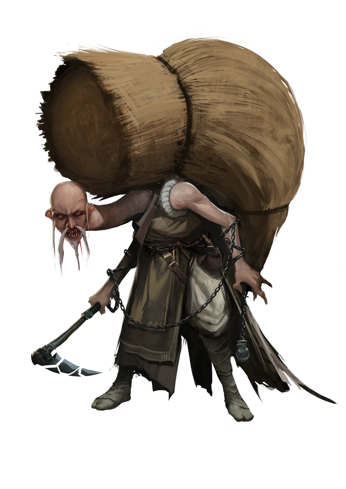 Kagekumas exist in the periphery, lurking in the very shadows of their prey. Known in some regions as “shadefiends,” this nindoru's ability to appear as uninteresting figures in the crowd allows them to feed even in populated areas. A kagekuma appears as a hunched over humanoid with a long neck and a fanged mouth, but when wearing a bundle, the creature's head and neck tuck in tight between its shoulders to become entirely obscured. The kagekuma personifies the cycle of trust being built and broken over and over again through the course of a complex relationship.
